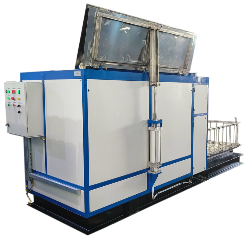 Машина оснащена мощными насосами высокого давления и замкнутой системой водоснабжения. Детали перед очисткой укладываются на транспортировочную телегу, затем подаются в моечную камеру.